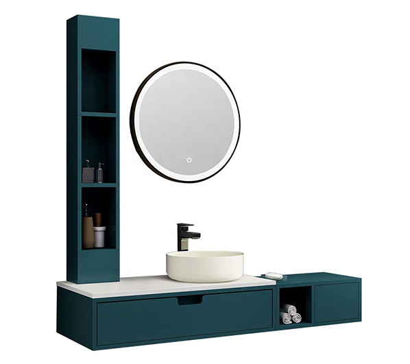 The overall suspended design with round mirror and washbasin matches the rectangular cabinet, giving your bathroom both elegance and modern style.